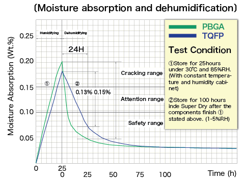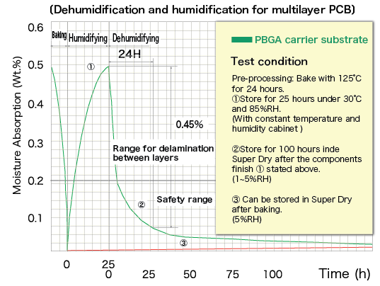 The moisture absorption is higher if the multilay PCB is thinner, and if the weight percentage exceeds 0.2, reflow heating will cause delamination between layers, so PCBs must be stored inside SUPER DRY.