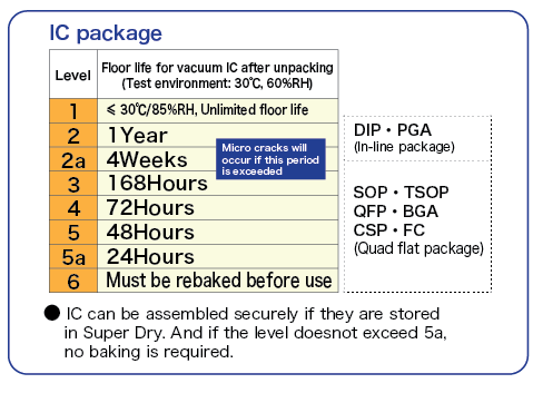 ⑥ Low humidity storage for IC: Accords with IPC-JEDEC J-STD-033C standard.