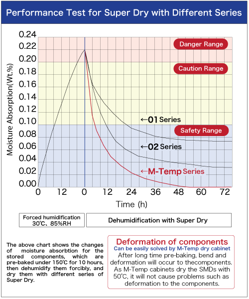 During reflow heating for SMD and IC package, the moisture inside the package will become vapor, causing powder breakage, especially when the weight percentage for moisture inside package is 0.15 for ultrathin IC packages, such as TSOP, TQFP etc., the damage may happen nearly 100%. As a replacement for baking or storage after baking, SUPER DRY is highly recommended.